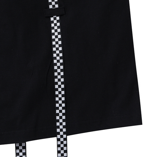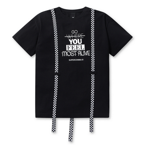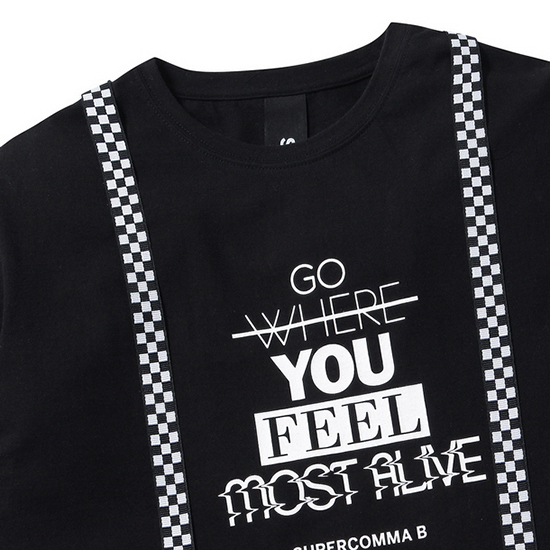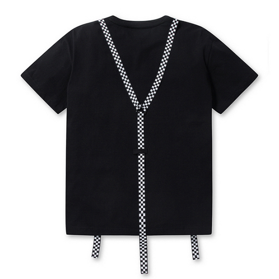 - 체크 서스펜더 디테일로 포인트를 준 공용 티셔츠.