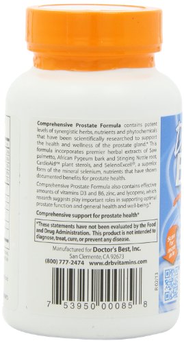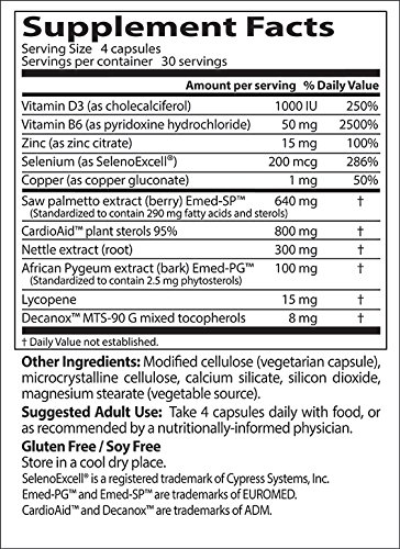 Comprehensive Prostate Formula contains potent levels of synergistic herbs, nutrients and phytochemicals that have been scientifically researched to support the health and wellness of the prostate gland. This formula incorporates premier herbal extracts of Saw palmetto, African Pygeum bark and Stinging Nettle root, CardioAid plant sterols, and SelenoExcell, a superior form of the mineral selenium, nutrients that have shown documented benefits for prostate health. Comprehensive Prostate Formula also contains effective amounts of vitamins D3 and B6, zinc, and lycopene, which research suggests play important roles in supporting optimal prostate function and general health and well-being.Feature