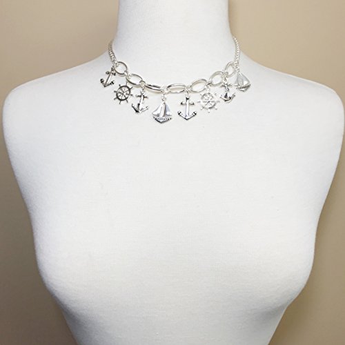 Burnished Silver tone chain link necklace feature anchors and ship wheel charms. 18 inch with 3 inch extender. Simple yet trendy and makes a great gift.