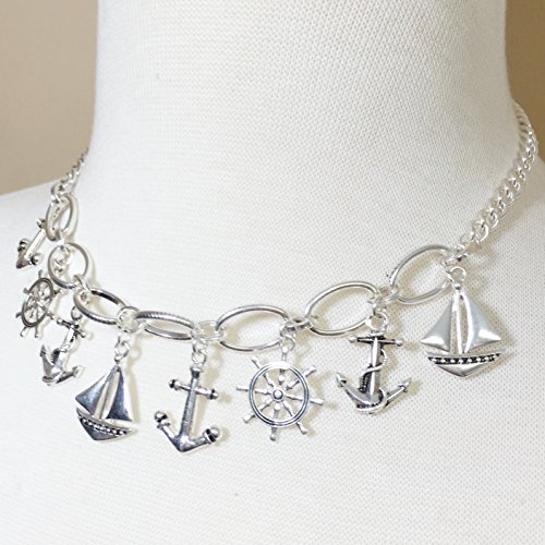 Nautical Charm Theme Silver Tone Necklace & Dangle Earrings Set (Anchor Ship Wheel Sailboat)