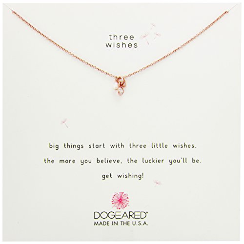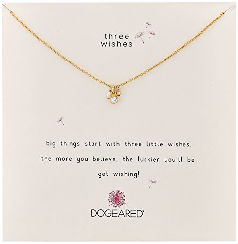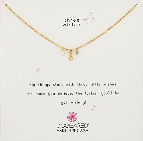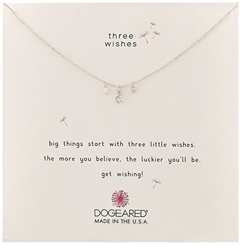 Big things start with three little wishes. Choose from sterling silver or gold-dipped sterling silver. Delicate necklace features three dangling charms. Spring ring closure. Handcrafted in California. Each Dogeared Jewels necklace and bracelet is packaged in a sweet and sturdy gift box. Measurements: Chain Circumference: 16 in Adjuster Length: 2 1⁄2 in Pendant Height: 3⁄10 in Pendant Width: 1⁄7 in Weight: 0.1 ozFeature