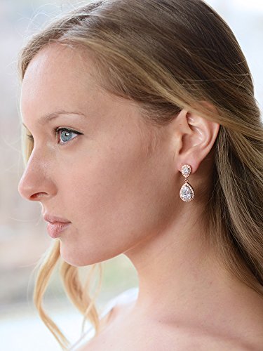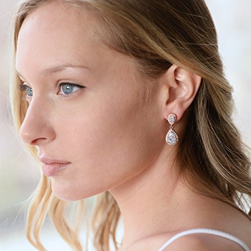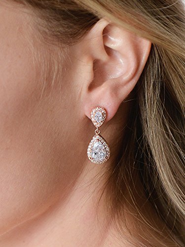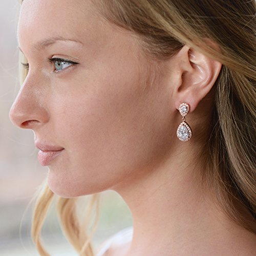 Good things come in small packages and our exquisite double teardrop Cubic Zirconia earrings are no exception! Despite their delicate size, these top-selling Rose Gold statement earrings add some serious sparkle to your bridal or evening attire. These gleaming dangles flaunt two faceted pear-shaped CZ drops, each with a glistening pave halo frame. Our gorgeous 1 1/4" h earrings are a stunning bridal accessory and make a splendid gift for bridesmaids, mothers of the bride, wedding guests or special occasions. We promise you'll love these best-selling Pink Blush beauties or your money-back. Treat yourself or someone you love to the gift of sparkling glamour at a price that will have you celebrating! AAAAA quality Cubic Zirconia, Genuine 14K Rose Gold plated and Lifetime Guaranteed.Feature