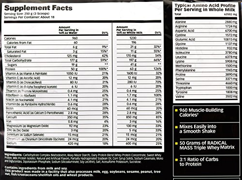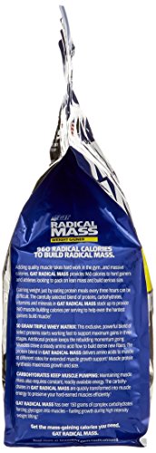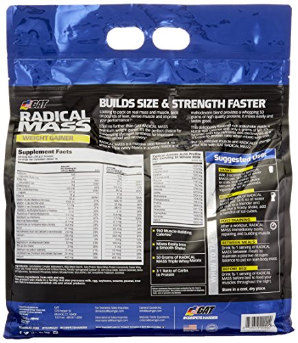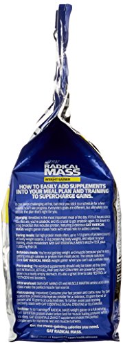ReleaseDate : 2016-04-21 Studio : GAT Publisher : GAT Binding : Health and Beauty Product Description In each of GAT Radical Mass's 250g servings you get 50g of protein from whey concentrate, sweet whey protein and milk protein isolate. 177g of carbohydrates (19g sugar, 1g fiber) from maltodextrin and waxy maize, 6g of fat (3g saturated), and a calorie total of just under 1,000 at exactly 960. You can see the full Radical Mass label below, although it is from a sample sachet so the numbers on the left are based on a quarter serving then on the right you have the amounts in a full 250g serving. 0