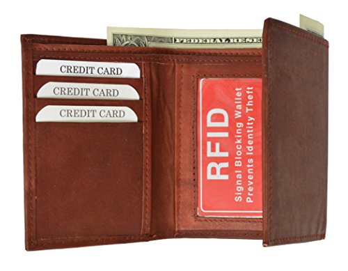Product DescriptionRFID blocking slim trifold leather wallet ID Window 6 credit card slots, 2 extra card slots 2 Bill compartments0