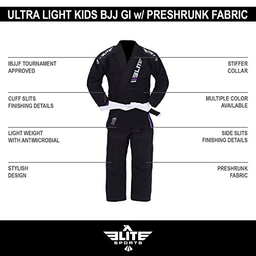Elite Sports IBJJF Ultra Light BJJ Brazilian Jiu Jitsu Gi For Kids w/ Preshrunk Fabric & Free Belt