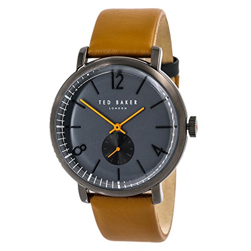 Give a handsome accent to your look with this Ted Baker® watch! Stainless steel case. Leather strap with adjustable buckle closure. Round face. Three-hand analog display with quartz movement. Grey dial features orange-tone hands and hour markers, single subdial, and Ted Baker detailing. Water resistant 165 feet. Display case included. Imported. Measurements: Case Height: 42 mm Case Width: 42 mm Case Depth: 11 mm Band Width: 4⁄5 in Band Circumference/Length: 9 1⁄2 in Weight: 2 oz This product may have a manufacturer's warranty. Please visit the manufacturer's website or contact us at warranty@support.zappos.com for full manufacturer warranty details.Feature