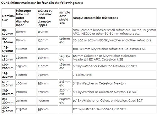 They are made from 2mm thick laser cut abs and the securing screws are capped with soft plastic so that they do not damage your telescope.These high quality Bahtinov masks are adjustable to fit a wide range of optical tubes, unlike masks which are only able to fit one telescope. They have adjustment latitude of about 175-220mm, depending on model, in aperture making them very versatile.