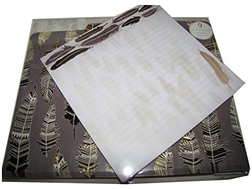 -. Feature : Bundle (2) Items: / Feather Design File Folders (9 pack) Browns and Gold Metallic on front side, feather design on reverse without metallic. / Coordinating pad of 80 sheets tablet brown/gold metallic feathers across the top. / Tablet measures 8" x 8".