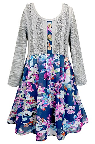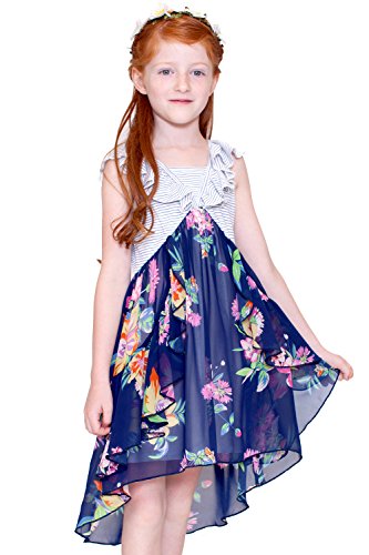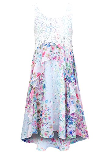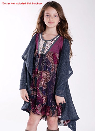 Let your little fashionista twirl in this vintage-inspired chiffon dress! The long sleeve hi low dress features a sweater raglan pinstripe top with a lace overlay and button embellishments. The skirt features a beautifully printed bohemian paisley on a ruffle hem hi low skirt. The perfect dress for your old-soul little girl!Feature