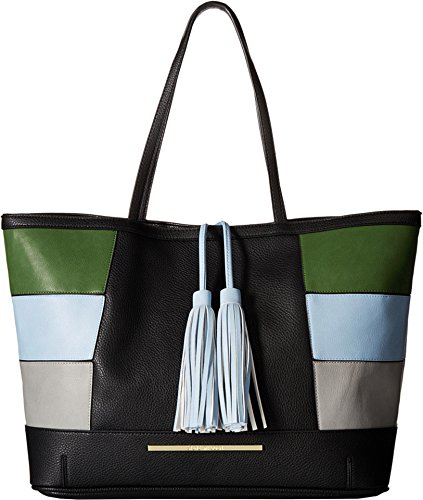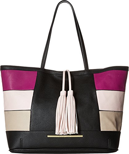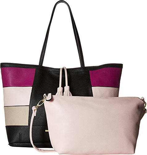 Magnetic snap closure. Additional zipper bag with removable strap. Dual flat carry handles. Exterior features color block design, brand plaque at front, and tassel detail. Flat base. Lined interior flaunts back wall zip pocket and two slip pockets. Imported.