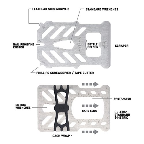-. Feature : Durable multi-tool constructed of 420 heat-treated stainless steel / High-tensile Cash WrapTM Strap, expands to hold cash and cards securely inside, won't stretch, weather, or wear / Secure and comfortable; low profile dual-plated design; travel and airport friendly / Includes: Cash WrapTM Strap, bottle opener, 5 standard-size wrenches, 6 metric-size wrenches, nail-removing knotch, phillips screwdriver, flathead screwdriver, scraper, metric and standard rulers, & protractor / Dimensions: 2.3" x 3.6" x .2" | 59mm x 91mm x 5.1mm; Weight: 1.7oz | 49g