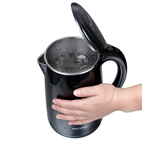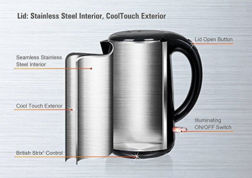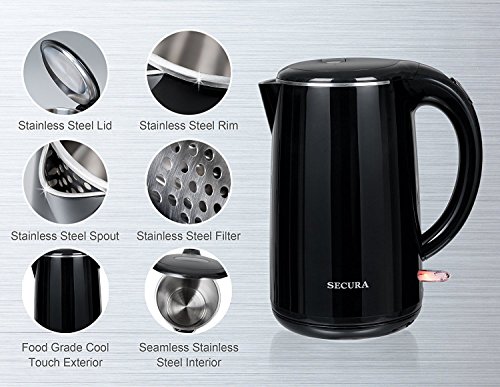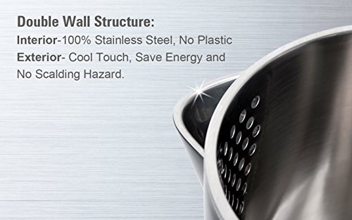 The Original Stainless Steel Double Wall Electric Kettle. This Hot Water Electric Kettle comes with 100% Stainless Steel Interior. Stainless Steel pot, Stainless Steel Lid, Stainless Steel Spout, Stainless Steel Rim. NO plastic in contact with hot water. Safe Healthy Drinking Water. BPA-Free Cool Touch Exterior, No Scalding Hazard. Saves Energy and Safe to Use. 1.7 Liter/ 1.8 Quart Capacity, ideal as an Electric Tea Kettle: Double-Wall Construction Boils Water Quicker and Keeps Warm Longer. British Strix control inside, Outlast Other Water Kettle. 2-Year Warranty. 120V 60Hz, 1500W Heating Power. ETL Approved Product. WARNING: More materials were used to make this double-wall electric kettle more durable and last longer. As a result, this kettle is slightly heavier than a regular 1.8 Quart stainless steel electric kettle.Feature