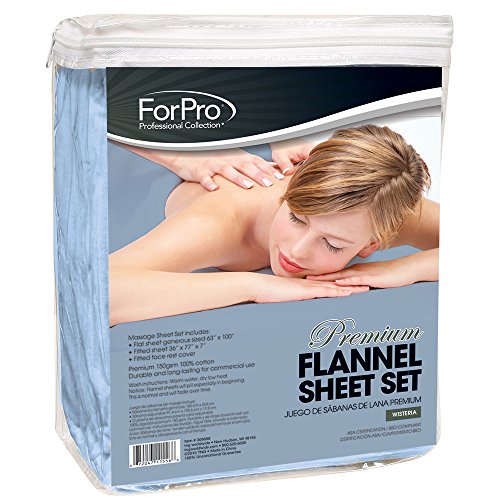 ReleaseDate : 2015-06-12 Studio : For Pro Publisher : For Pro Binding : Health and Beauty Product Description Premium flannel sheet 3-piece set is premium 150 GSM 100% cotton. Set includes generous 63 inch x 100 inch size flat sheet, 36 inch x 77 inch x 7 inch fitted sheet and fitted face rest cover. Durable and long lasting for commercial use. Wash instructions: wash in warm water. Dry in low heat. Notice: flannel sheets will pill, especially in the beginning. This is normal and will fade over time. ASA certification/BSCI compliant. 0