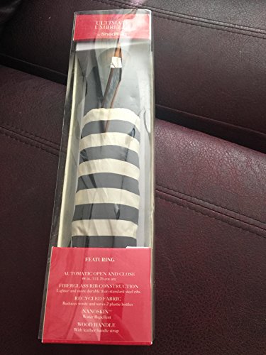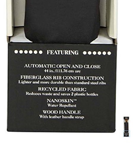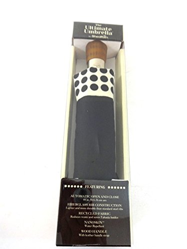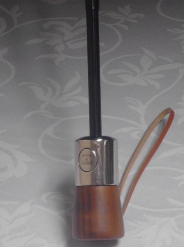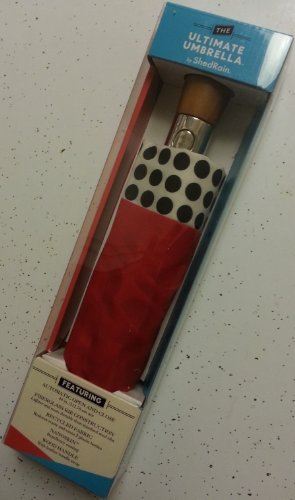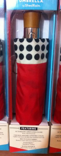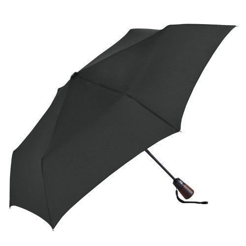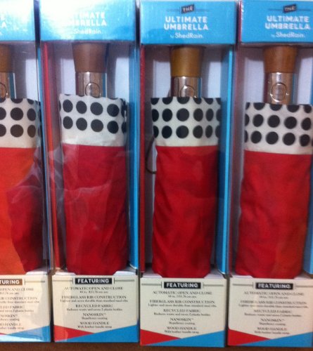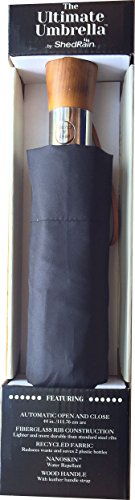 Product Description New for 2014 For Men Women. This umbrella has a sleek wood handle with leather handle strap, black electrostatic steel shaft and ribs, and is easy open and close with the push of a button. The ShedRain Ultimate Umbrella opens to 44" ARC, Only 12" long when closed will fit in your purse 0
