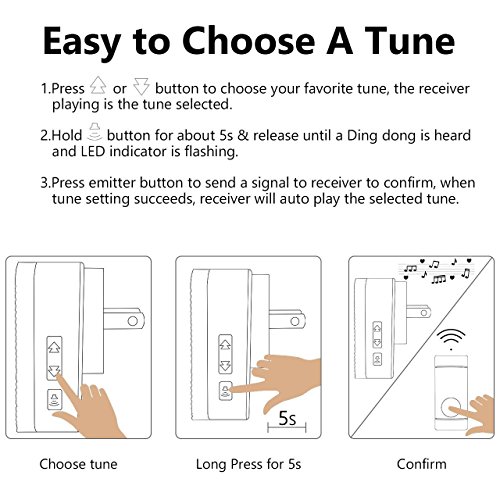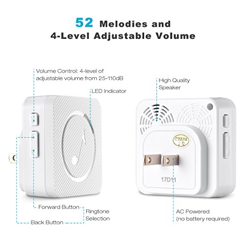 - 52 Different Melodies - There are 50 different Chimes with 4 levels of adjustable ringing volume from 25-110dB,which include dingdong, Christmas song (jingle bells) and more. Simply press the forward/backward button to choose.Control the volume via volume button on the receiver with ease.
