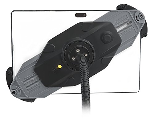 -. Feature : Weighted tablet stand that fits any 7 inch to 11 inch device: iPad, Kindle, Samsung, Microsoft, or Sony. The computer mount has a maximum height of 52 inches and a minimum height of 25 inches. The adjustable-height telescoping pole can be raised or lowered by opening and closing a smart clamp located half-way down the length. / Gooseneck is swiveling and full motion. The stand can be adjusted to fit any angle or orientation. The flexible gooseneck measures 12 inches in height and securely holds its position with ease. The neck can be adjusted to fit any of your needs whether you're standing, sitting, or laying down. / Rotating touch-screen mount is equipped with a 360 degree rotation. The mount can spin around to give your tablet any orientation or direction. The grips on the mount rotate 15 degrees as well providing a flexible range of positions specific for your tablet model. The mount and grips are also equipped with soft EVA cushions protecting the surfaces, back, and edges of your case or display. / Easy locking and unlocking features keep your tablet in place. The adjustable widths of the mount make it multi-device capable and ensure a secure fit between the grips and your product. The lock feature is safely hidden on the underside of the device as an easy-to-use switch. / Stand is made from solid ABS thermoplastic and steel construction in a glossy black finish. The base of the stand is 10 pounds making it easy to carry and stable on the floor. The hardware comes with an extra EVA cushion to support thinner devices.