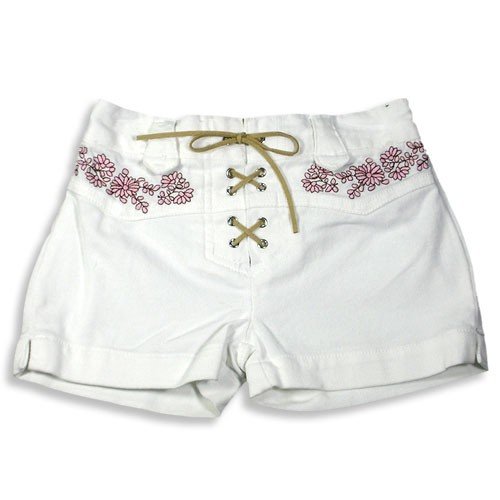 Twill shorts with style is all she needs when getting dressed, Features a suede tie up with an inside snap and an elastic back waistband for a snug fit, The embroidered flowers add pizazz, Made of 100% cotton, Machine wash and dry recommended