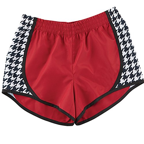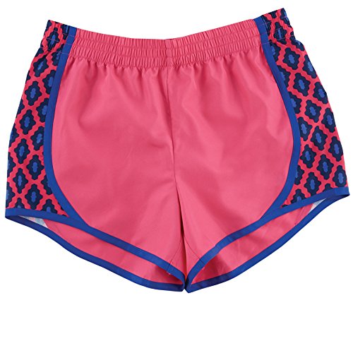 Woven poly track shorts have printed side panels and elastic waistband with pop color piping.