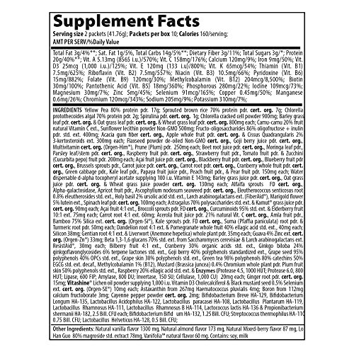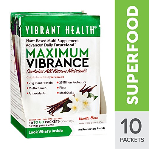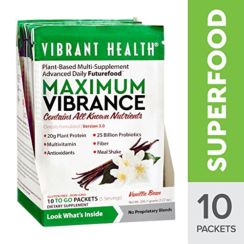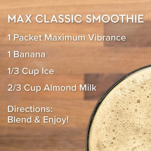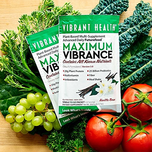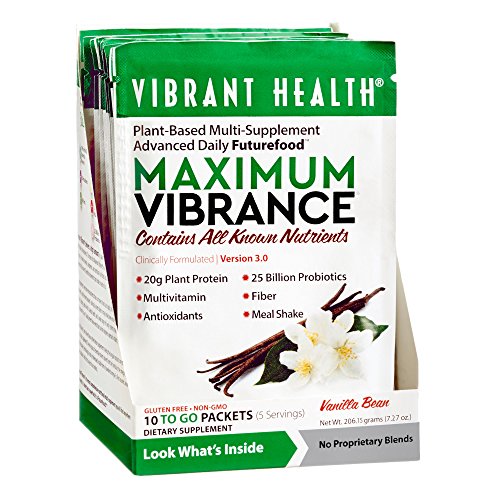 Maximum Vibrance delivers a meals worth of high protein, almost no fat, plus a Paleolithic dose of micronutrients. What is meant by a Paleolithic dose of micronutrients? The term means that Maximum Vibrance will feed the human body a broad and rich range of vitamins, minerals, polyphenols, and nutritional co-factors at levels that closely match the high requirements of the ancient, Paleolithic biochemistry that resides in each of us. We are programmed to need more micronutrients than our modern food can supply. When we don't get enough of them - and there are thousands - biological systems falter or may break down entirely. Immunity, growth, maturation, healing, cardiac health, skeletal health, and a broad number of body systems may begin to function poorly. The only group of essential nutrients absent from the formula is the omega-3 fatty acids. Unfortunately, technology has not yet developed a stable form of powdered omega-3s. Rest assured, when it becomes available it will find its way into our product. The organic cereal grass juice powders, spirulina, ample chlorella, vegetables and fruits deliver broad nutrition and effective detoxification. Our classically powerful blend of 25 billion probiotics per serving from 12 strains of beneficial bacteria, are here too, just as they are in Green Vibrance. Use two packets (enclosed in the jar) for a complete meal replacement or one packet to your beverage for a light substitution. Either way, the pleasant taste of Maximum Vibrance permits its use in any beverage from water through juices to almond milk, or any smoothie. Maximum Vibrance contains 120 ingredients which include 80 plants, 26 antioxidants, 6g of fiber, 7 servings of fruits and vegetables, 7 vegetable based digestive enzymes, 23g of protein and so much more!Feature