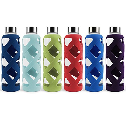 Glass Water Bottles Shatter-Resistant Borosilicate Optional Multicolor Silicone Sleeves 550 ml 18 Oz, 6-Pack