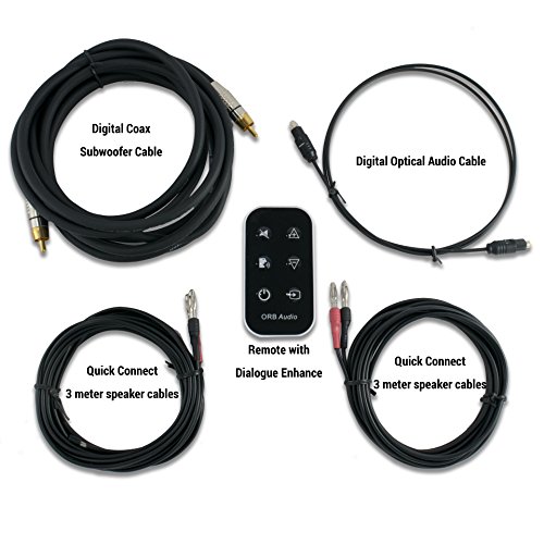 Easy to use soundbar alternative from Orb Audio – includes Booster Mini Amp with remote control featuring proprietary Dialogue Enhance function (amp dimensions 5”x3.5”x1.5”), one pair of Orb Audio Mod1X Speakers (each speaker 4.25”x4.25”x4.5”), one Orb Audio subMINI Powered Subwoofer (9”x9”x9”) and all necessary wires to connect the speakers, subwoofer and amp to your digital (optical) AV source.
