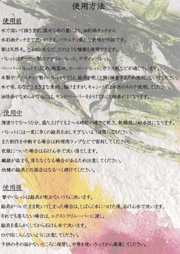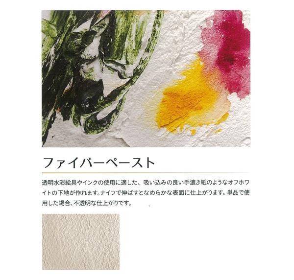 透明水彩絵具やインクの使用に適した、吸込みの良い手漉き紙のようなオフホワイトの下地が作れます。ナイフで伸ばすとなめらかな表面に仕上がります。単品で使用した場合、不透明な仕上がりです。 |
