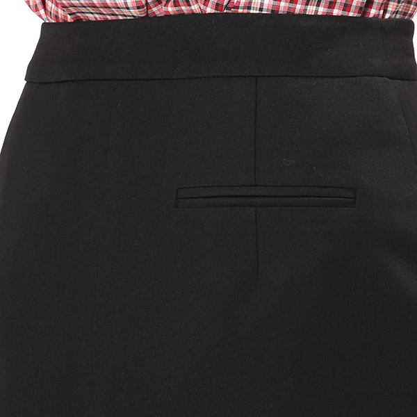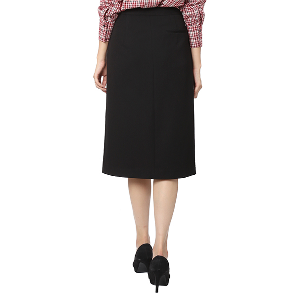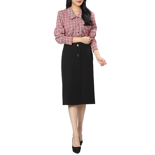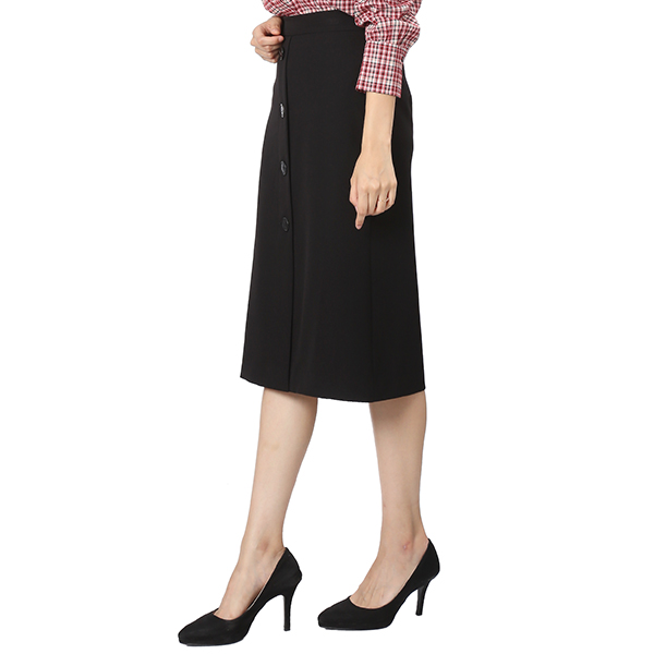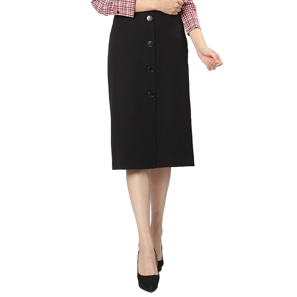 블랙 색상의 H라인 스커트로 세련된 분위기를 연출해 줍니다. 단추 장식 디테일로 유니크한 감성을 담았습니다.