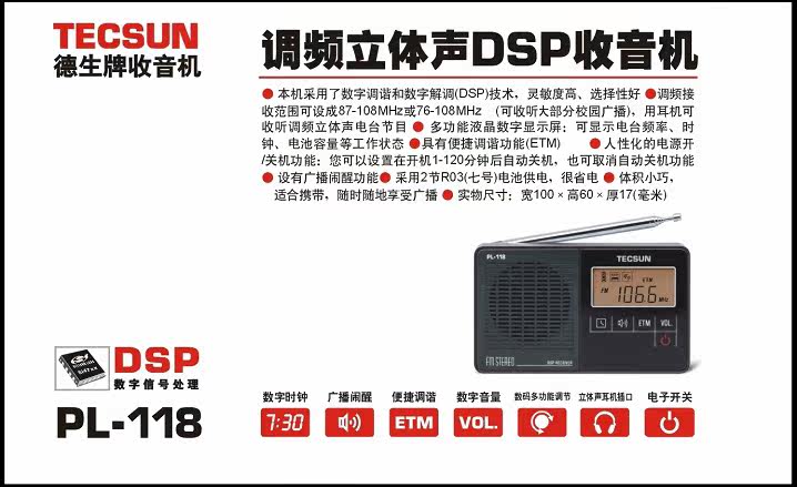 TECSUN PL-118-------便携式纯调频(DSP)立体声收音机