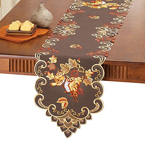 Lovely table toppers feature embroidered Fall leaves with charming owls perched atop the branches. They have an intricate scrolling cut out design along the edges, and are perfect on their own or with a coordinating tablecloth underneath (sold separately). Machine wash. Polyester; imported. Size available in Runner (67"L x 13"W) or Square (34"Sq.