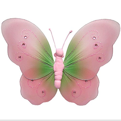 -. Feature : Hanging Butterfly Green & Pink Two-Tone Nylon Mesh Butterflies Decorations. Decorate a Baby Nursery Bedroom, Girls Room Ceiling Wall Decor, Wedding, Birthday Party, Bridal Baby Shower, Bathroom, Home, Playroom, Kids, Childrens Butterfly Wall Decoration 3D Art DIY Craft / Ideal for baby nursery, kids bedroom, girls room & home decor. This nylon peachy-pink butterfly with accented color has two-tone painted wings with pretty glitter & sequins. This pretty organza butterfly decoration is made with a soft bendable wire frame. / Hang this beautiful butterfly from the ceiling or attach to the walls (hardware not included). Butterfly comes prestrung with a piece of clear fishing line and round plastic hoop for easy hanging, which is perfect to hang butterflies from the ceiling or it can be removed if attaching to the walls. Width measurement is complete wingspan. / This hanging mesh nylon butterfly decoration comes in a variety of colors & sizes (sold seperately). This colorful butterfly is also a perfect decorations for girls birthday party, baby shower or wedding decor. We offer combined shipping, so please visit our Amazon store for more great items: www.amazon.com/shops/Bugs-n-Blooms / Sold individually; mix-and-match styles, sizes & colors as they are designed to coordinate together. Please note: sizes are approximate, handmade & variances may occur. For tips & sestions, please visit our 'How To Hang' page: http://www.amazon.com/gp/aag/details/ref=dp_mi_seller_details?ie=UTF8&seller=A2RFZLVKNCOP5I#custom