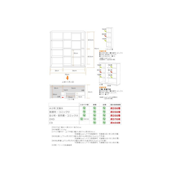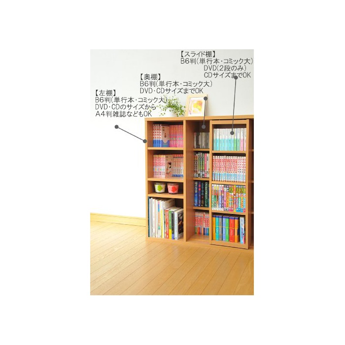 【수납 가능한 본 미디어】 슬라이드붕:A6사이즈(문고본)신서판(신서 코믹소)B6사이즈(실용서 코믹대)DVD(2 단만),오선반:A6사이즈(문고본)신서판(신서 코믹소)B6사이즈(실용서 코믹대)DVDCD,좌선반:A6사이즈(문고본)신서판(신서 코믹소)B6사이즈(실용서 코믹대)DVDCD