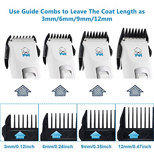 Complete Pet Grooming Kit: Includes 2 pieces 2-in-1 blade guards to leave the hair length as 3mm, 6mm, 9mm, 12mm for home groomers to ensure your pet safety; a professional pet trimming scissors and a stainless steel comb are also included for haircut perfections. (blade oil not included due to air restriction).