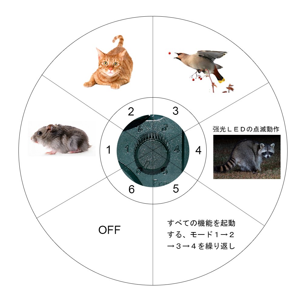 (Mode 2) Cats, raccoons, badgers, skunks, etc. / Ultrasonic oscillation: 19.5 KHz to 24.5 KHz