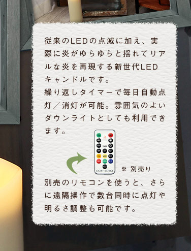 ●専用の赤外線リモコン(別売り)を使った遠隔操作が可能で、複数のキャンドルが有る場合も点灯、調光、