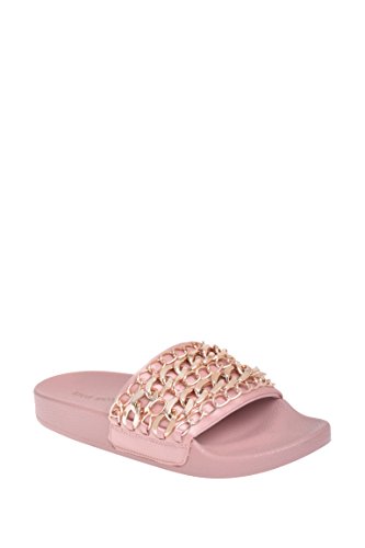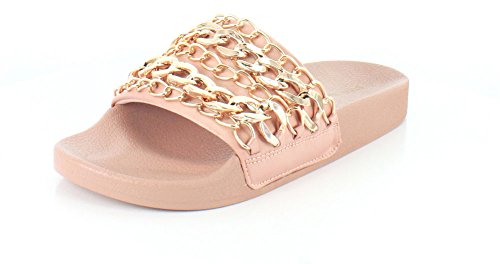 Product DescriptionStep into chains- a fun slide sandal with gold chains at the upper. a comfortable footbed makes this sandal a treat for your feet as well0