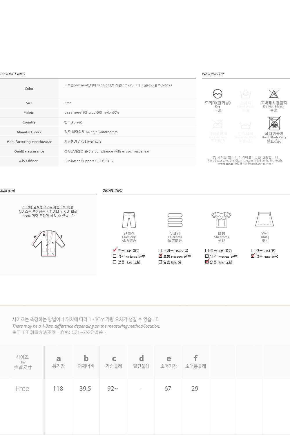 천연 섬유의 캐시미어는 숨쉴 수 있는 시간이 필요합니다. 착용 후 통풍이 잘되는 곳에 보관해 주세요. 니트 제품은 옷걸이에 걸지말고 꼭 접어서 보관해주세요. 길게 늘어지거나 모양이 변형 될 가능성이 있습니다.