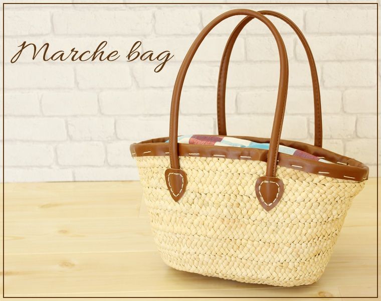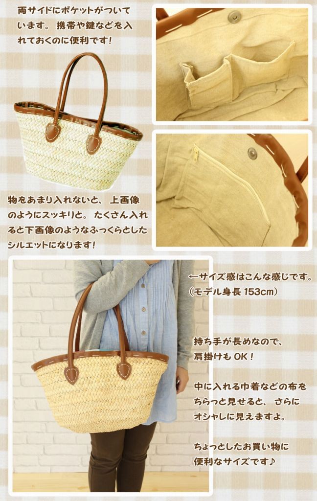 | おススメ使用用途 | ちょっとしたお買い物に便利なマルシェバッグです。あまり中身を入れないと、スッキリとしたシルエット!買い物帰りはふっくらとしたシルエット!どちらもとってもオシャレです♪ 中に巾着やバッグinバッグを入れて、その柄をちらっとみせたり、アレンジしても楽しいですよ。画像では、チェック柄の布を中に入れて撮影してみました。(※中の布は付属しません、ご注意下さい。) |