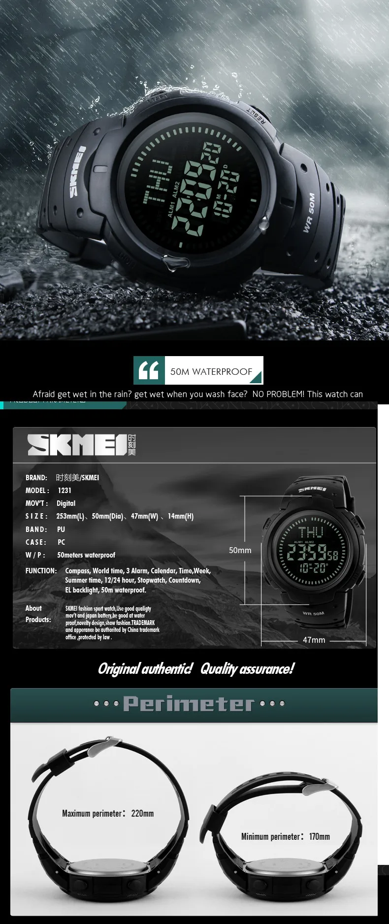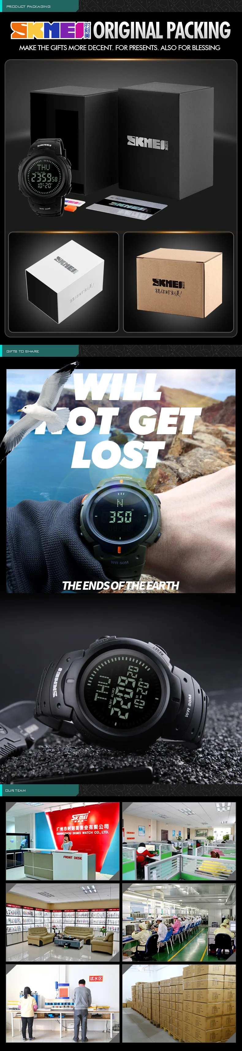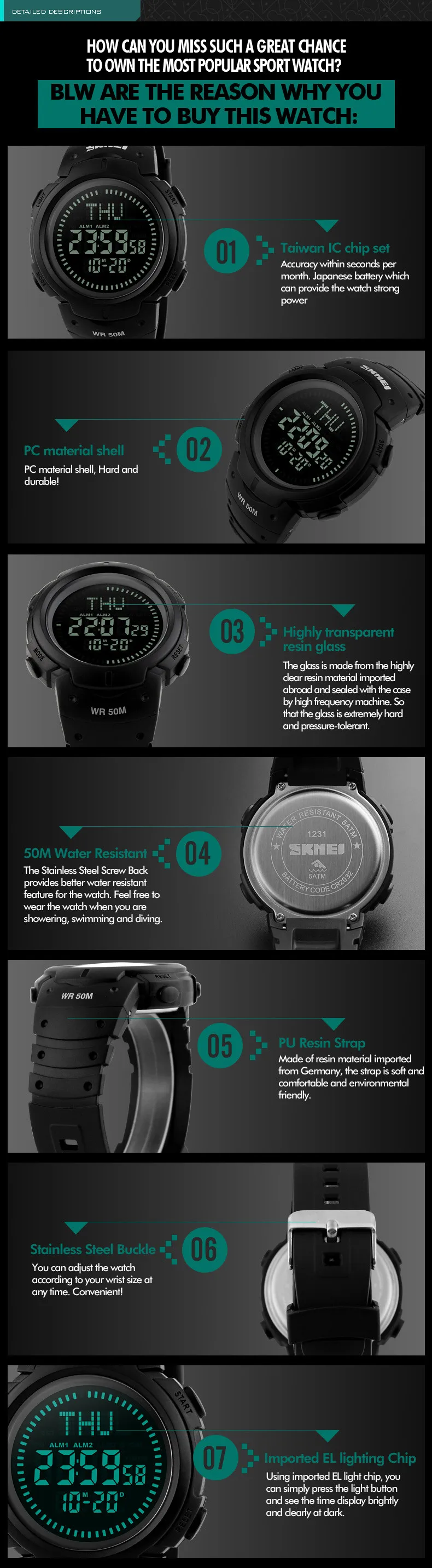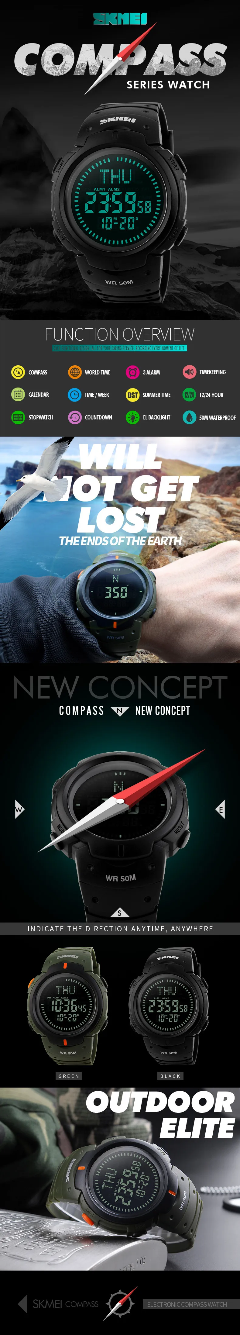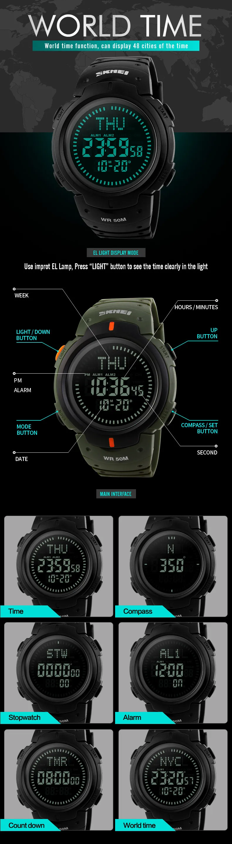Feature:Water Resistant,LED display,Multiple Time Zone,Stop Watch,Compass,Back Light,Complete Calendar,Week Display,Alarm,Swim
