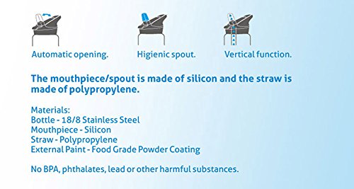 Flip cap w/straw, press button opens drinking spout, no need to bite, just press and sip