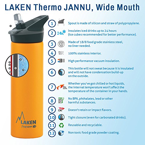 The beautiful and versatile Laken Thermo Jannu is a vacuum insulated stainless steel water bottle that can hold cold drinks chilled for up to 24 hours. It has a double layered stainless steel construction with vacuum between the two layers that provides excellent thermal insulation. The Thermo Jannu has a sport cap with a flip straw that allows drinking without lifting up the bottle. You can hold the bottle and open the cap using a single hand, by pushing the press-to-release button. The body of this wide mouth bottle is made up of 18/8 food grade stainless steel that is chemically inert and makes sure that your beverages remain fresh and safe for long time periods. These bottles are BPA, phthalate and lead free with no inner liner. The interior is 100% INOX so there is no leeching effect.Feature