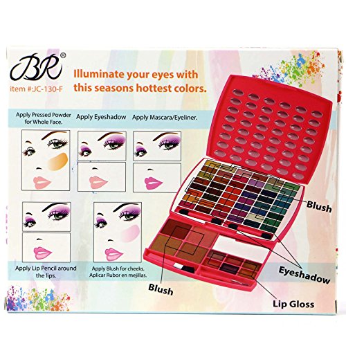 -. Binding : Misc. -. Brand : BR -. EAN : 0716189013068 -. Feature : BR Professional Makeup Palette #JC130F / This Palette comes in 22 Eyeshadows, 30 Blush and 6 Lip Gloss / 4 different Professional Applicators / Perfect for both Professional Salon or Home use! / High quality ingredients with silky shine color, can last for all day long! -. Label : BR -. Manufacturer : BR -. Model : JC130F -. MPN : JC130F -. PartNumber : JC130F -. ProductGroup : Beauty -. ProductTypeName : BEAUTY -. Publisher : BR -. Studio : BR -. Title : BR Professional Makeup Palette 22 Eyeshadow 30 Blush 6 Lip Gloss #JC130F -. UPC : 716189013068