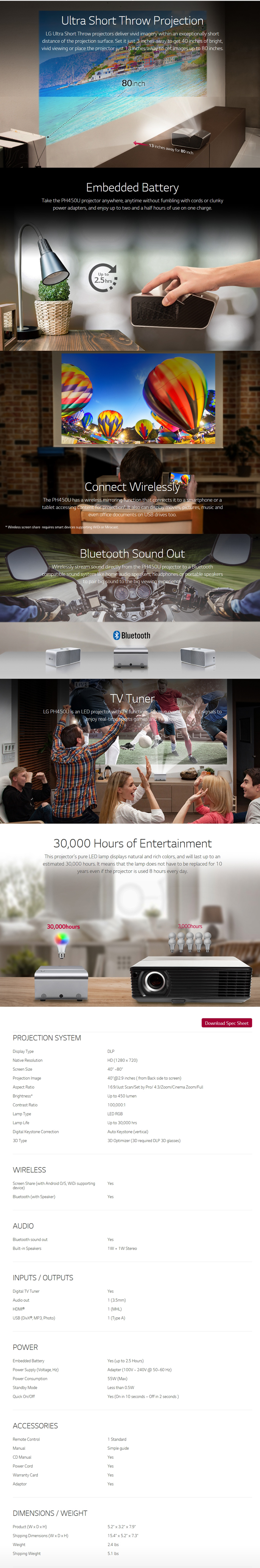 LG PH450U is an LED projector with TV functions. Receive over-the-air TV signals to enjoy real-time sports games and TV shows.