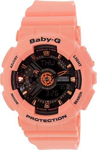 Brand, Seller, or Collection Name:Casio Model number:BA-111-4A2ER Part Number:BA-111-4A2ER Model Year:2014 Display Type:analogue -digital Clasp:Buckle Case diameter:43 millimeters Case Thickness:16 millimeters Band Material:Plastic Band width:19 millimeters Band Color:Pink Dial color:Black Item weight:1.60 Ounces Movement:Quartz Water resistant depth:100 Meters