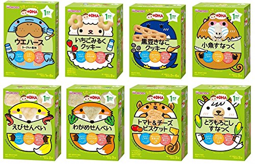 和光堂の1歳からのおやつ+DHAシリーズのおやつの各種1箱ずつの8個セットでございます。