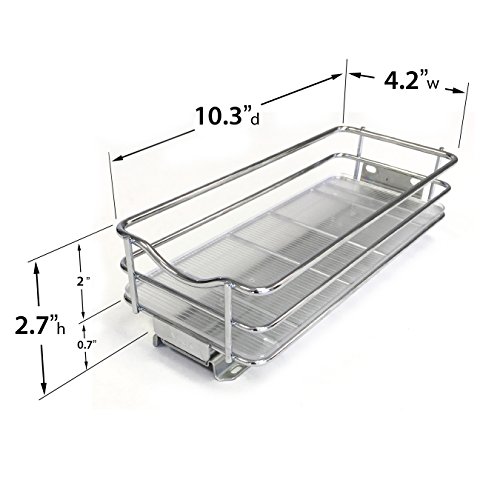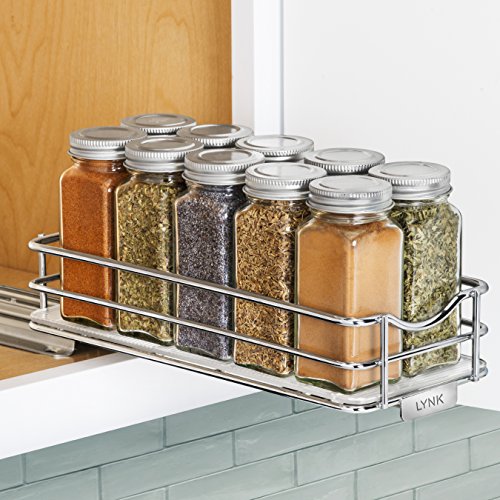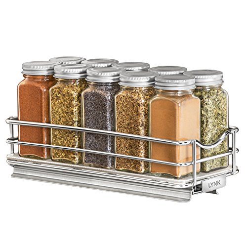 Studio : Lynk INC Publisher : Lynk INC Binding : Home Product Description Lynk’s slide out spice rack gives easy access to all your spices in your kitchen cabinets and pantries. Our unique ProGlide full-extension ball bearing glide adjusts from 10.3 inches to 12.8 inches for the various depths of upper kitchen cabinets and pantry shelves. The Lynk Professional pull out spice rack holds 10 standard size spice jars (jars not included). No need for special jars, you can keep your herbs and spices in their original containers. Our sliding spice rack eliminates clutter on your countertops and in drawers by organizing spices, condiments, and oils in your kitchen cabinets. Includes a durable polycarbonate tray to protect cabinets from spills while keeping even the smallest items stable. The tray is removable and washable. Lynk’s commercial quality steel and beautiful chrome finish give you unparalleled strength and durability for a lifetime of trouble-free use. Lynk’s ProGlide industrial-grade ball bearing glide ensures smooth sliding every time. And with our proprietary Easy Mount design, setup is quick and easy with just 2 screws ? included. The Lynk Professional Spice Rack is also available in a two-tier design. Product Dimensions: 4.2 inch wide x 10.3 to 12.8 inch deep x 2.7 inch high. Hardware included. 0