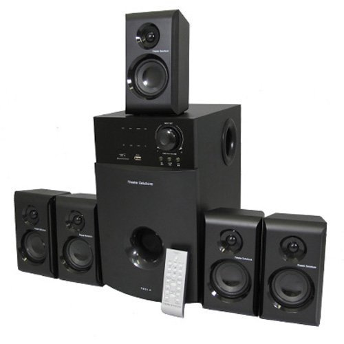 Theater Solutions TS514 5.1 Home Theater Speaker System is a compact, high-definition 5.1 / 2.1 switchable home theater system that's simple to set up and use. The TS514 features a Pro Surround channel switch to integrate all your surround formatted movies, music and games and deliver a true surround experience. The Speaker system consists of five speakers - left, center and right front channels with two rear surrounds - and one powered subwoofer with a built in tuner. All five 2 way speakers in this home theater are identical, creating a seamless blend of sound and style. Inside each modern, high-gloss black enclosure, you'll find durable, high-quality components that will provide superior performances for years to come. Each speaker is magnetically shielded - so it won't interfere with your TV picture - and can be positioned vertically or horizontally next to your HDTV or other type of flat-panel. This home theater system's subwoofer delivers class-leading, room-shaking bass thanks to a powerful digital hybrid subwoofer amplifier and a 5.25-inch driver. Featuring a sleek black high-gloss finish, this hard-hitter also includes an at your fingertips remote, so you can customize the level of bass for your room and independently control the front, rear, and center channel speaker. Sound accounts for half of the home theater experience, whether you're watching a movie or sporting event - or even playing a video game. Your TV is only one piece of the puzzle. It's the audio that drives the action, creates the mood and brings your video content to life. So, make the TS514 part of your home entertainment today.Feature