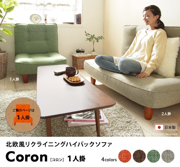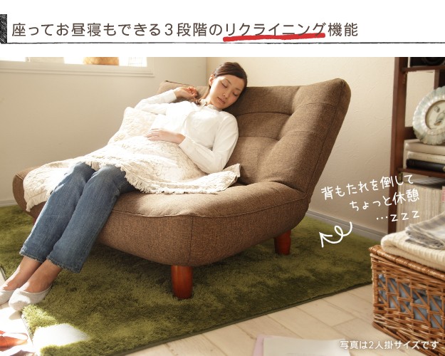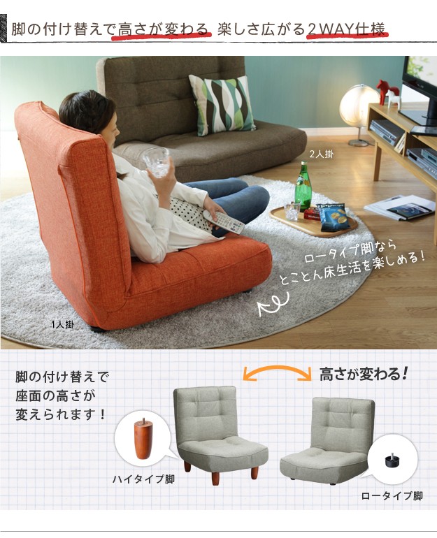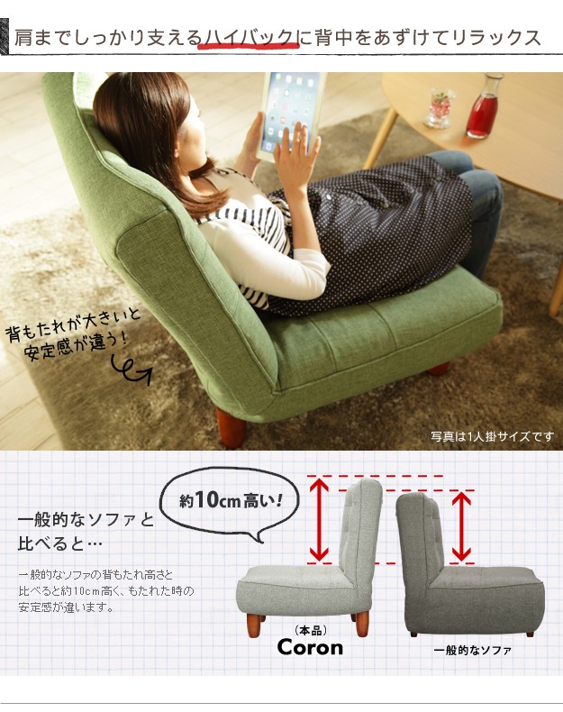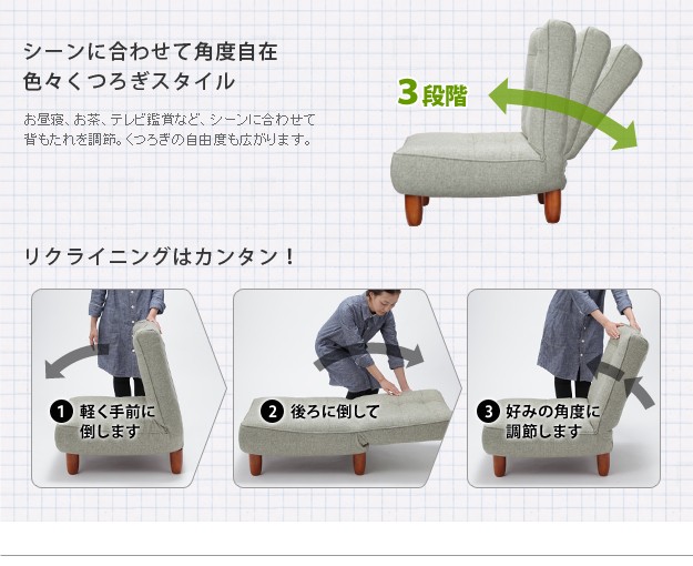 商品について:大きな背もたれがリクライニングする一人掛けソファ。肩までしっかり支えるハイバックに背中を預けてリラックス。3段階のリクライニングはどんなシーンでもくつろぎを与えてくれます。脚の付け替えで座面の高さを変えることができます。