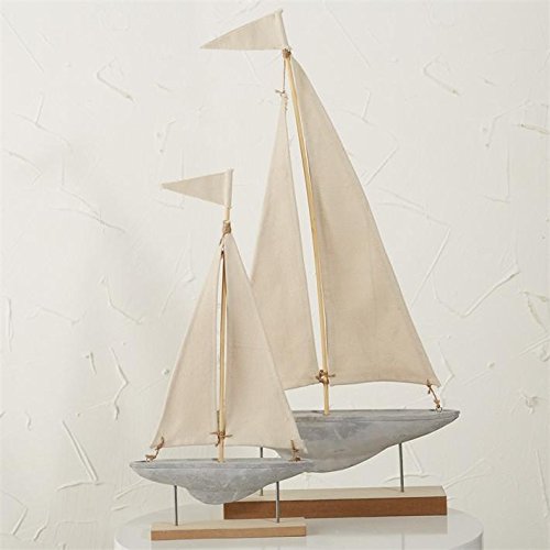 -. Feature : You can almost feel gentle sea breezes through the sails with this softly stated cement sailboat figure with canvas sails. / This freestanding sailboat has solid hull, wood mast and natural canvas mainsail, jib and flag. / Looks great in picture or bay window, on shelf or fireplace mantel, dining table centerpiece or any counter top or flat surface. / Two sizes available (each sold separately): / Medium measures 18-1/2-in H x 9-1/2-in W x 2-3/8-in D and Large measures 27-1/4-in H x 13-3/4-in W x 3-in D