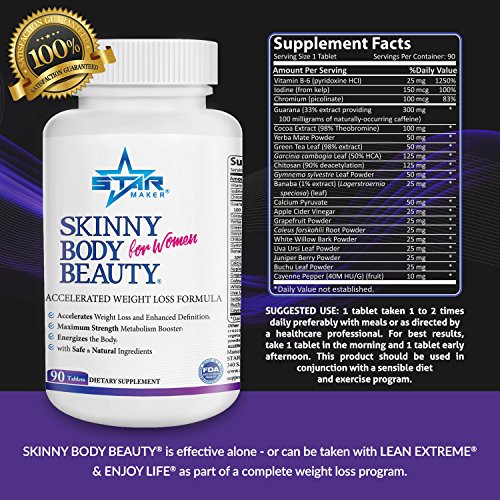 -. Feature : Ultra Rapid Weight Loss & Enhanced Definition: Powerful fat burner diet pills, maximum strength metabolism booster and appetite suppressant working synergistically together to help you preserve lean mass and also eliminate body fat and excess water weight, leaving you with a healthy female physique. SKINNY BODY BEAUTY - the superior weight loss pills for women that work fast. / Maximum Natural Energy & Enhanced Mental Focus: Conquer your active day, Crush your workouts and cardio sessions with jitter-free, smooth & clean energy, enhanced focus, and an improved mood while losing weight. Can be used as a primary weight loss supplement pills, and can also be used for those emergency moments that you need to quickly lose a couple extra pound of body fat and excess water. Create incredible results FAST!! / All Natural & Scientifically Tested Formula: Safe & Effective. Formulated by Medical Doctors and Oriental Medicine Doctors. Trusted and used by Hollywood celebrities and TOP athletes. Specially crafted and made with only the finest quality, all-natural ingredients to help burn stubborn body fat and get rid of excess water weight fast. Support your weight loss goals and give you the Highest Quality of Life you can enjoy / The Most Advanced Weight Loss Supplement for Women on the Market: With all-natural ingredients including Green Tea Leaf, Garcinia Cambogia Extract (HCA), Coleus Forskohlii Root, Guarana, Cocoa Extract, Gymnema and more. The combination of these ingredients provides an overwhelming advantage to any other supplement on the market, ensuring you will improve your energy levels & metabolism while decreasing appetite and cravings / It Works or Your Money Back: All our nutrition supplements are manufactured in our state-of-the-art FDA registered manufacturing facility that is NSF and cGMP certified in the US, and 3rd party safety tested, ensuring every dose is of the highest potency without any artificial additives or harsh chemicals. Every purchase comes with our 45 days money back guarantee in the unlikely case you are dissatisfied with it. NO QUESTIONS ASKED!