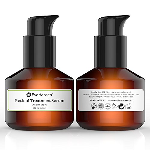 Retinol, derived from Vitamin A, helps combat early signs of aging, along with helping to correct existing damage. Our 2.5% Retinol Treatment Serum is formulated with natural and organic ingredients to help improve the appearance of uneven skin tone, fine lines and deep wrinkles. It is also fortified with Squalane, which acts as a barrier for protecting and refining the skin from moisture loss and providing a shield from environmental toxins while looking and feeling hydrated. Your skin will give off radiance as this serum solution will lighten dark spots, heal and restore damaged skin, and bring dull complexions back to life. Retinol will help increase the skin's defense mechanisms for harmful UV rays. If using retinol during the day, you must wear sunscreen. Reduce the appearance of lines, wrinkles, marks, age spots, and hyperpigmentation, dark circles, age spots, on your skin. This miracle whitening and skin conditioner product will provide a flawless complexion by penetrating deep into your skin to help eliminate damage and promote restoration. Pair it with another serum such as hyaluronic acid and use with your favorite cleanser, cream or lotion, and oil for maximum strength and added benefits. Eve Hansen's potent Retinol Treatment Serum is safe for all skin types including dry, oily, combination and sensitive. The serum is safe, non-oily, fragrance free (no perfume added), paraben free, vegan friendly, use it confidently and without worrying about breakouts, damaging or drying out your skin. Regenerate skin and enjoy a flawless, timeless appearance.Feature